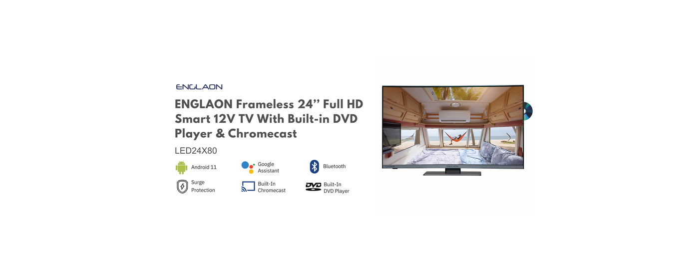 ENGLAON Frameless 24″ Full HD Android Smart 12V TV With Built-in DVD player and Chromecast